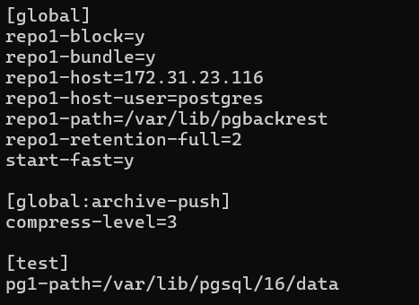 - sudo cp /etc/pgbackrest.conf /etc/pgbackrest.conf.backup