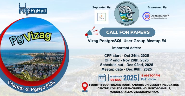 Join us for an inspiring morning of learning, networking, and collaboration โ bringing together PostgreSQL professionals, students, and enthusiasts from across Vizag and beyond.