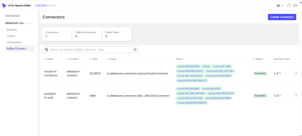 After confirming the Oracle source connector is running, validate that the PostgreSQL sink connector is also active.