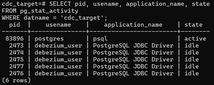 Before testing CDC flow, confirm that the debezium_user in PostgreSQL: