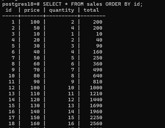 postgres18=# INSERT INTO sales (price, quantity) VALUES