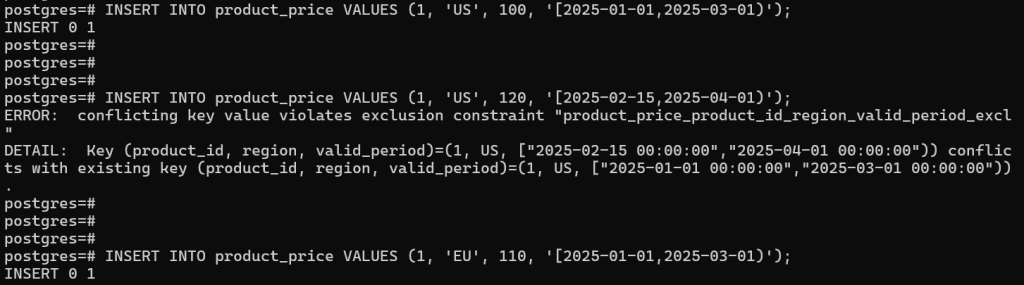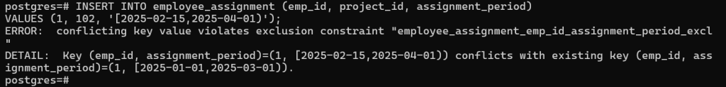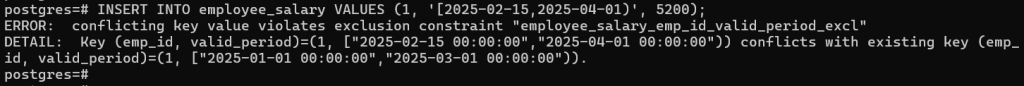 ERROR: conflicting key value violates exclusion constraint "employee_salary_emp_id_valid_period_excl"DETAIL: Key (emp_id, valid_period)=(1, ["2025-02-15 00:00:00","2025-04-01 00:00:00")) conflicts with existing key (emp_id, valid_period)=(1, ["2025-01-01 00:00:00","2025-03-01 00:00:00")).