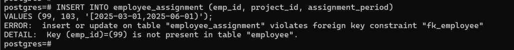 postgres=# INSERT INTO employee_salary VALUES (1, '[2025-02-15,2025-04-01)', 5200);