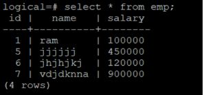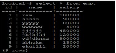 logical=# create table t1 (id int,name varchar(20),contact int,address text);
