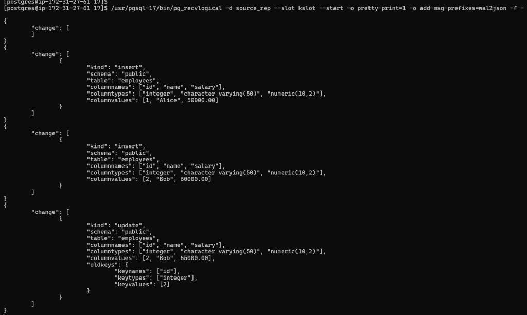 /usr/pgsql-17/bin/pg_recvlogical -d source_rep --slot kslot --start -o pretty-print=1 -o add-msg-prefixes=wal2json -f /var/lib/pgsql/output_file.json