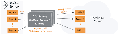 ClickHouse’s Kafka engine enables real-time ingestion with exactly-once semantics. The pattern involves a Kafka table, a materialized view, and a destination table.The following shows a sample example.