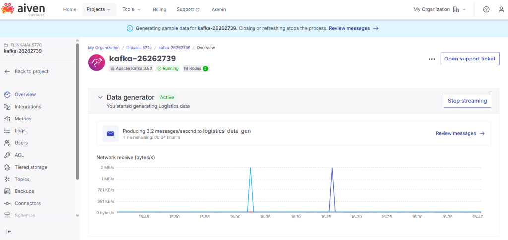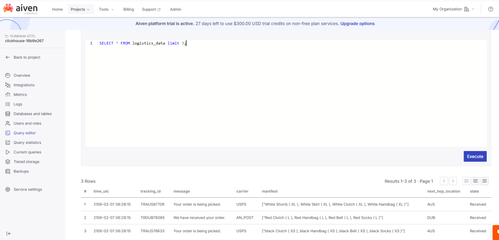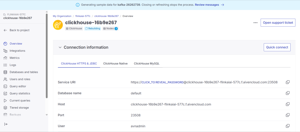 5. view the same Integration use aiven ClickHouse query editor and view the streaming messages from Kafka.