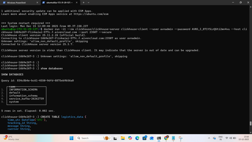 4.Run clickHouse service via docker and create materialised views and run the sample query as “SELECT * FROM <Table Name> Limit to view streaming data.