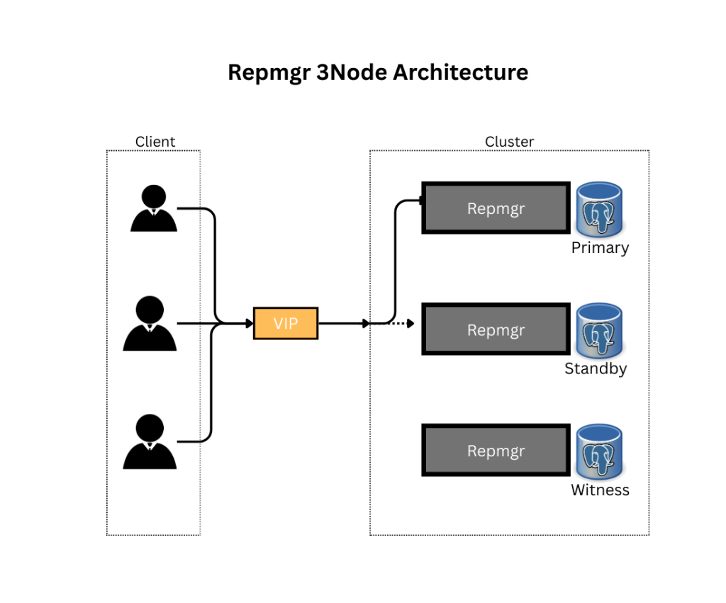 We all know that Repmgr (Replication Manager) is an open-source tool designed to manage PostgreSQL replication and facilitate automatic failover. Let’s understand the underlying architecture which is crucial for making informed decisions about your high availability setup. In high availability systems, components span multiple layers, with different configurations assembled based on specific requirements. This post explores the architectural design of a three-node repmgr cluster consisting of one primary, one standby, and one witness node, while highlighting critical considerations around fencing mechanisms and virtual IP management.